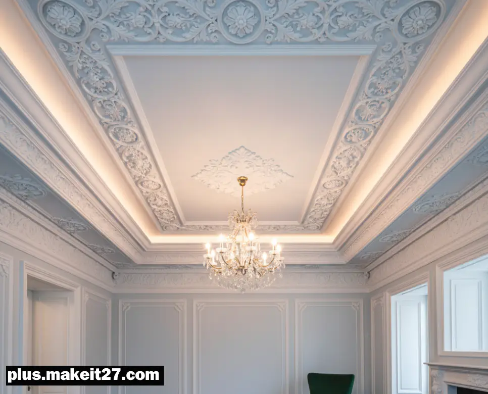 - 천장 몰딩 (Crown Molding): 벽과 천장이 만나는 지점에 설치하는 형태입니다. 공간에 깊이감과 웅장함을 부여하며, 상단의 불규칙한 마감을 깔끔하게 가려줌으로써 대중들이 실내 공간에서 안정감과 완성도 높은 고급스러움을 느끼도록 돕는 실무적인 디자인 요소입니다.